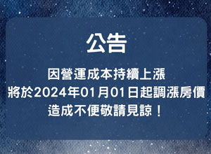 因營運成本持續上漲,將於2024年01月01日起調漲房價,造成不便敬請見諒
